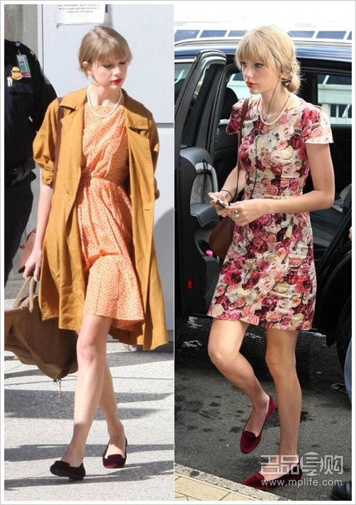 小美女泰勒酒红色绒布平底鞋搭配印花复古裙,修身裙装勾勒身体曲线,以珍珠项链装饰,有着古典的华贵感。
