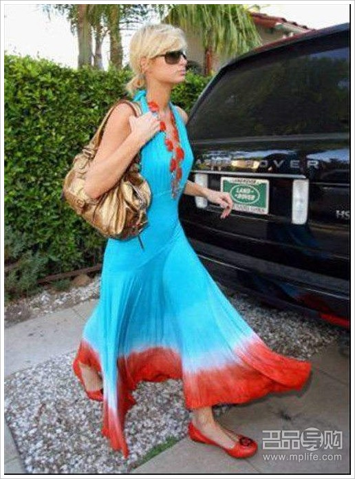 色彩浓郁的波西米亚长裙,红色的平底鞋和同样红色的裙尾及项链呼应得恰到好处。