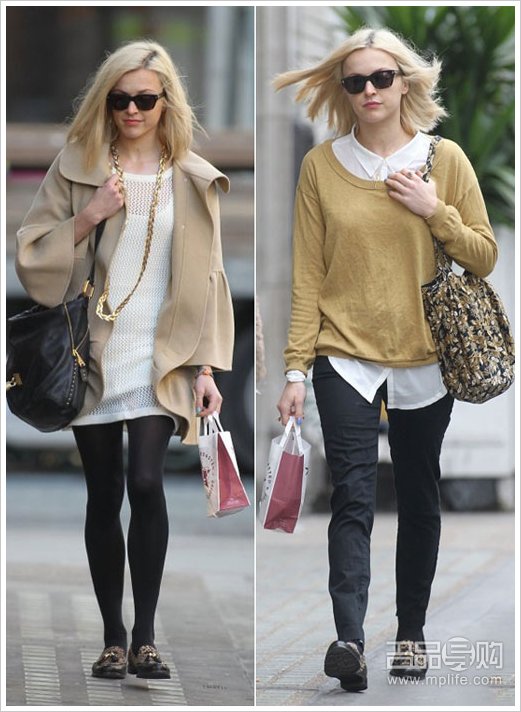 美女主播Fearne Cotton 最近很爱这双平底鞋,豹纹拼接更有时尚感,白衬衫+套头衫+哈伦裤搭配,清新的颜色在这个春天看起来相当舒服。