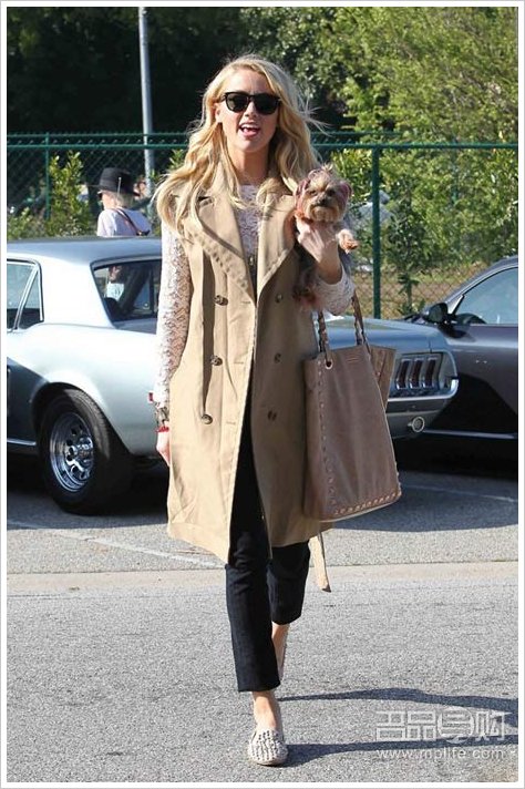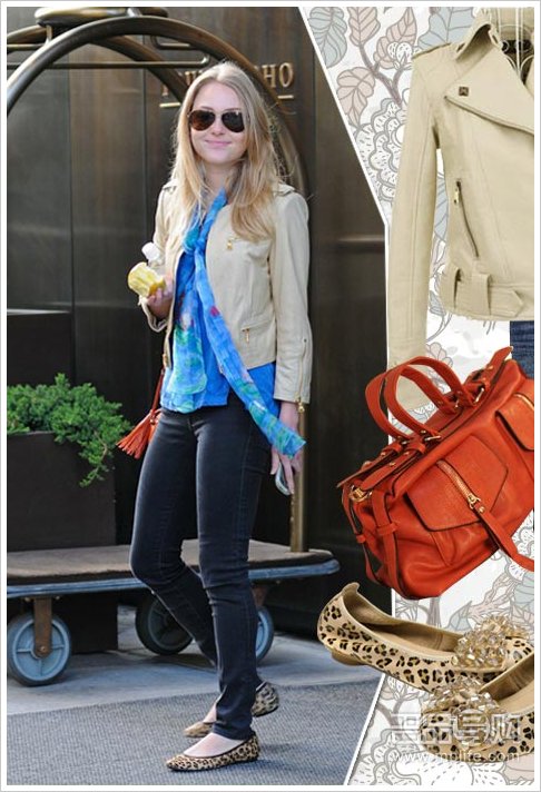 Annasophia robb选择了米棕色的皮衣,米色的皮衣更适合春日的搭配。而且她似乎对于撞色十分偏爱,又是蓝色的内搭和围巾与橙色包包相撞,一双舒适的豹纹平底鞋,带来更为浓厚的春日气息。