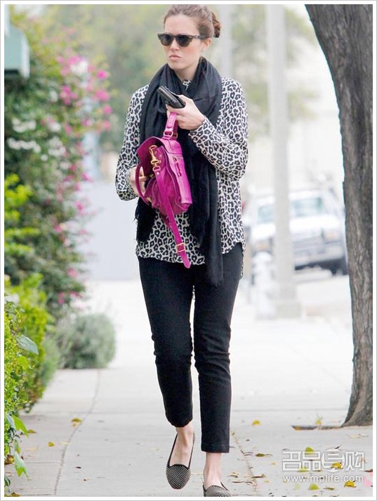 Mandy选择了一款豹纹T恤搭配黑色小脚裤的搭配,豹纹T恤时尚性感,搭配百搭显瘦的黑色小脚裤很相配。整体搭配的亮点就是紫色PS1包包和黑色铆钉平底鞋,时尚的款式和靓丽的颜色让整体搭配变的抢眼时尚!
