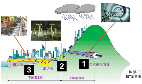 在与“洪水猛兽”的长期战斗中,香港人总结出卓有成效的“防洪三招”可供其他城市借鉴:上游截流、中游蓄洪、下游拓渠。