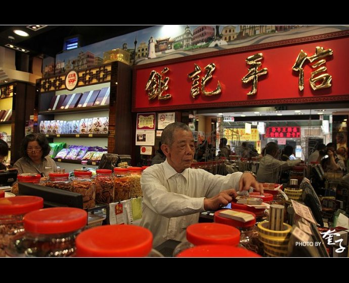 在澳门上百个“手信”品牌中,据说钜记与咀香园是最大的两个。只要有买手信的地方就能看到钜记。