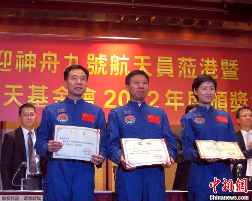三名神九太空人接过曾宪梓博士授予的奖状,接受全体嘉宾的祝福。神九航天员景海鹏表示,真正的功劳属于千千万万默默无闻的航天工作者,天宫一号与神舟九号成功实现交会对接是全体科技工作者辛勤努力的结果,也离不开香港同胞的关心和支持。