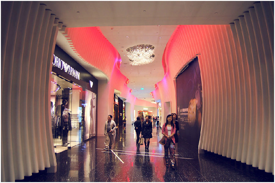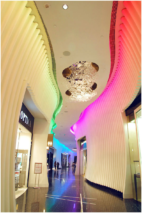 走在高雅别致的新濠大道,你会感叹这里简直是现代建筑设计艺术的一个典范。独特的墙壁和天花造型,打上色彩艳丽的灯光,仿佛两条悬在空中迎风飘舞的丝绒绸带。随时随地都浸透着艺术的气息,令人赏心悦目。