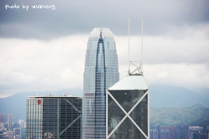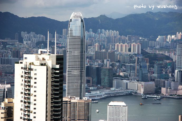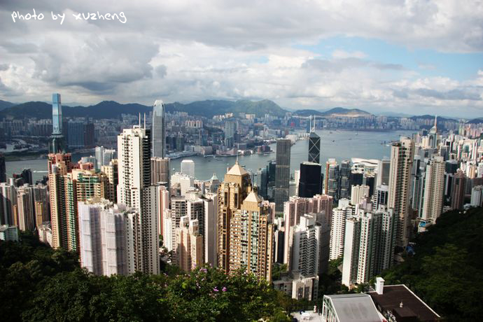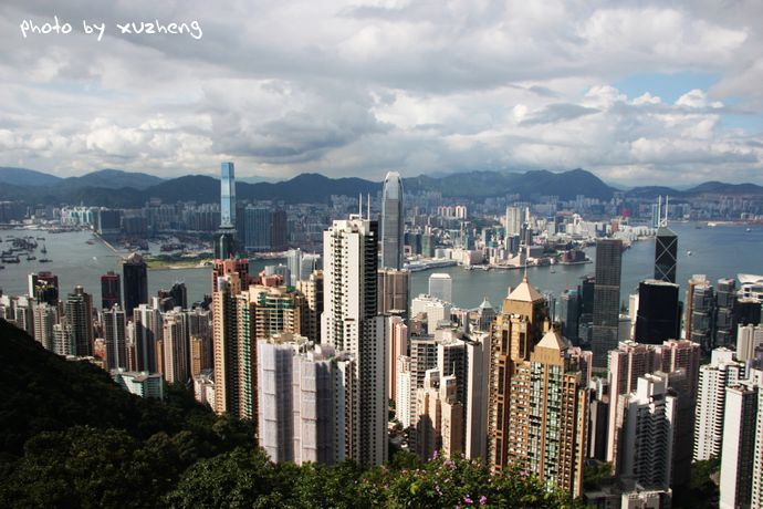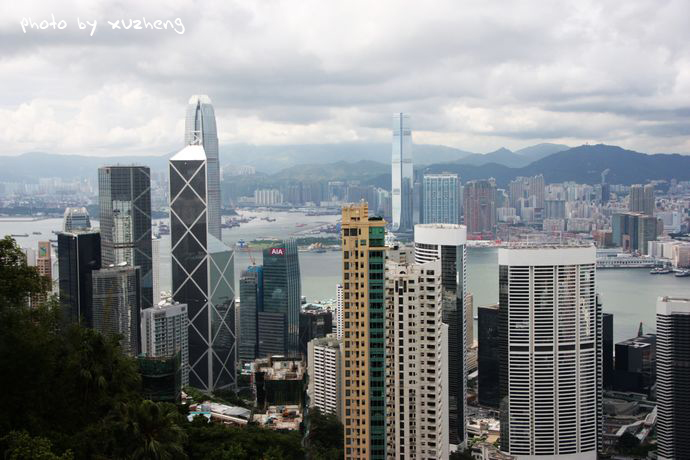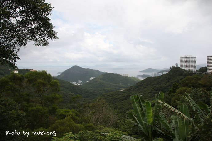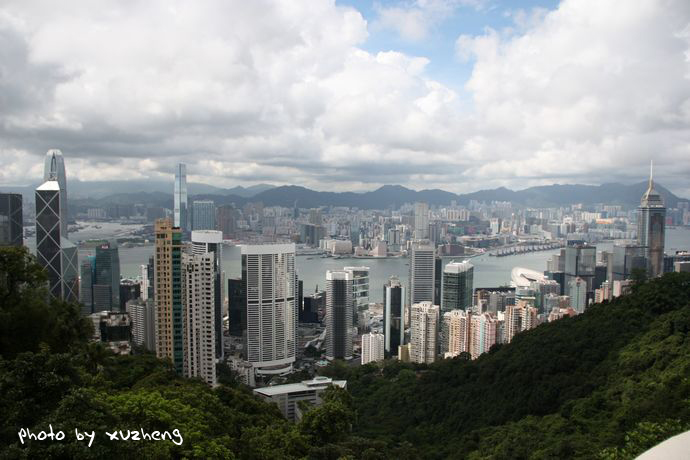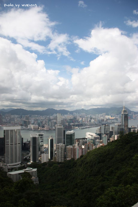 不管如何,也是徒步上山,对于我来说也是一次难得静心体验香港的机会。那山上的无穷树木却愈发郁郁葱葱,满目青翠,遮云蔽日,那峭壁的岩石边长满了厚厚的绿苔,给夏日的香港增添了丝丝清凉,弯曲盘旋的山路总是让我们一直认为快要登顶而连连绝望。当然,登山的好处就是可以从中看到更为细致的景观,而不是单单凌霄阁上那单一的角度。一步一脚印缓缓登上,只见在青山绿水间,跌宕起伏的高楼在争艳夺俏,慢慢的从下到上,从左到右,中国银行、汇丰银行、金融中心大厦、港澳大厦、湾仔会议展览中心这些再也熟悉不过的建筑以多个角度呈现于眼里。这一次尝试的足以让我欣喜。