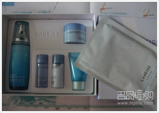 兰芝水库精华套装 送了5个中小样 230米精华60ML+水和乳各10ML 睡眠面膜20ML 保湿面霜15ML 面膜贴1片