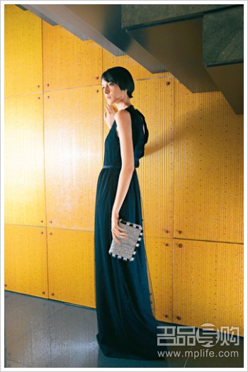 黑色雪纺露背晚装连身裙( $32,580 )、黑色条纹蟒蛇皮 Daisy Clutch ( $14,080 )