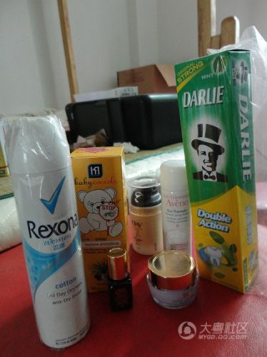 蕊娜和防蚊水是帮朋友带的,雅诗兰黛的眼霜,精华,玉兰油的防晒,雅漾的水,还有牙膏自用的。牙膏是在药房买的,3支装,已经拆了。嘻嘻