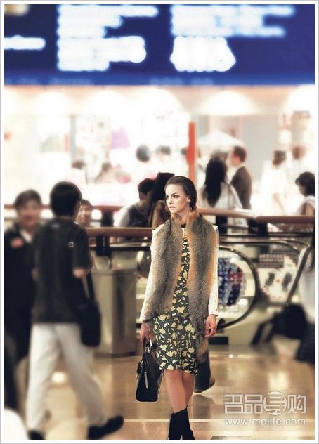 米色图案恤衫$6400、绿色图案连身裙$9200、毛毛颈饰$9900、深蓝色漆皮手袋$11,000、黑色短袜$500、黑色缀白边高跟鞋$4700(林俊源摄)