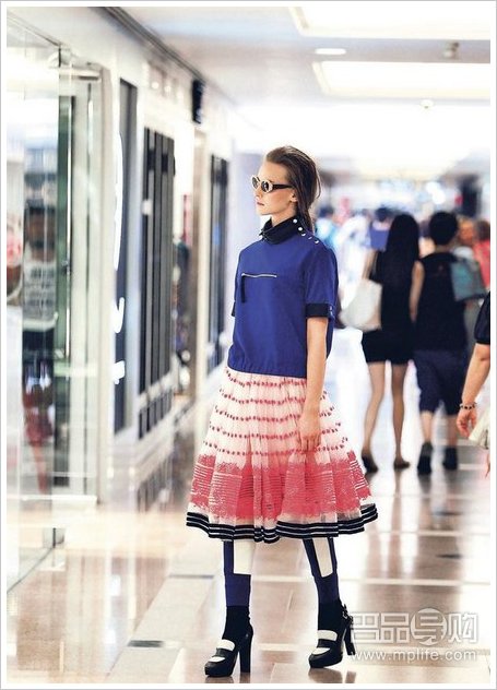 蓝色拉链上衣$6900、橙色间条短裙$9900、蓝白直间leggings $4900、黑色短袜$500、胶框太阳眼镜$2900、黑白高跟鞋$5500(林俊源摄)