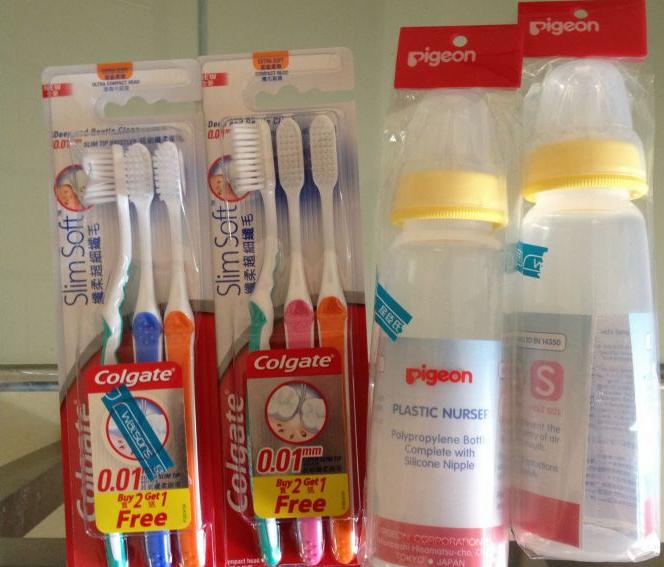 屈臣氏买的奶瓶,想买大孔的买不到,就只剩这两个了,HK29.9元,高露洁的牙刷HK28左右两排