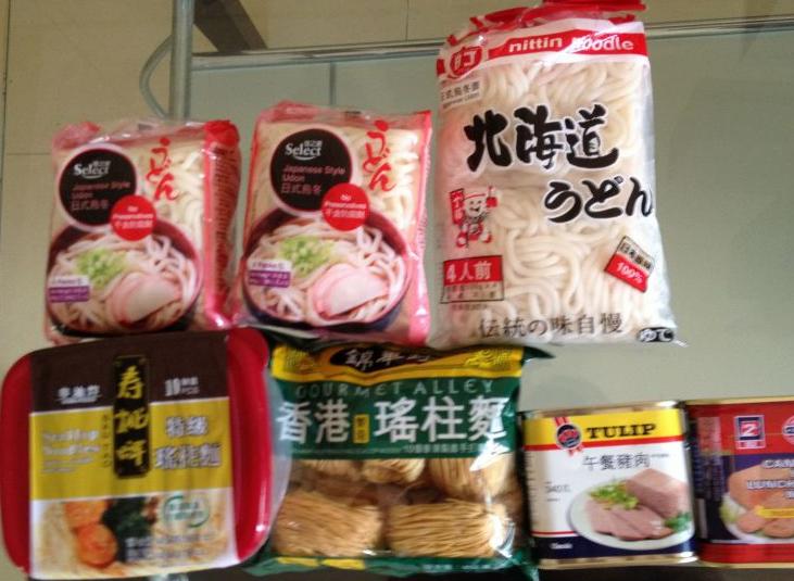 这个重死了,乌冬面我女儿超爱吃,佳之选的一包HK7.9元两包15元,里面有三小包,大的那包HK9.5元里面有四小包,寿桃牍的瑶柱面HK16元送个微波炉的保鲜盒,中间绿色包装的也是瑶柱面,看到它写的香港制造的我买包试试也不贵HK10元,午餐肉HK15.6元
