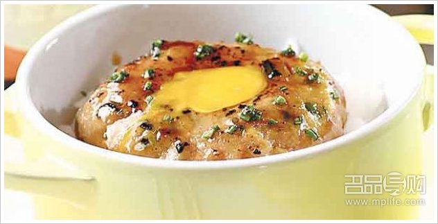鸡腿肉加上沙葛粒打成冬甩形肉饼,中间凹位放上生鹌鹑蛋,再配上烧汁,够晒Juicy。