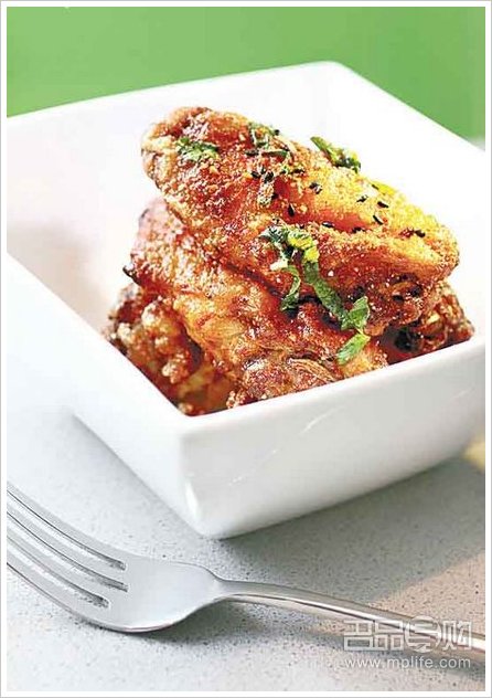 日本鸡翼加豉油、姜、味醂等腌过夜,印度米煎香磨碎后和面粉混合后,沾在鸡翼表面一齐炒,再淋上青柠汁、鱼露、芫荽和薄荷叶等混合酱汁,再洒上七味粉,脆到不得了。