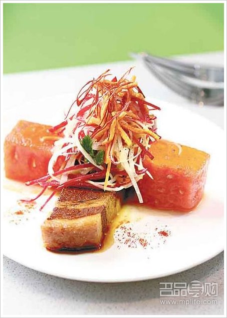 那霸甜薯猪腩加味醂、豉油、清酒等混合叉烧酱慢煮4小时再雪冻;马来西亚西瓜用是拉差酱汁、蒜、葡萄籽油等捞匀。上面再放上22号脆面和各种蔬菜,配着甜酸沙律汁吃,非常消暑。