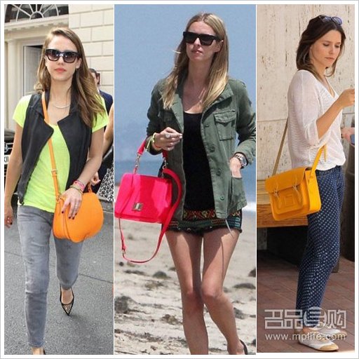 左:Jessica Alba绿色的t恤搭配橘色的挎包,尽显春夏的活力,黑色的马甲正好平衡一下两种色彩的冲突感。