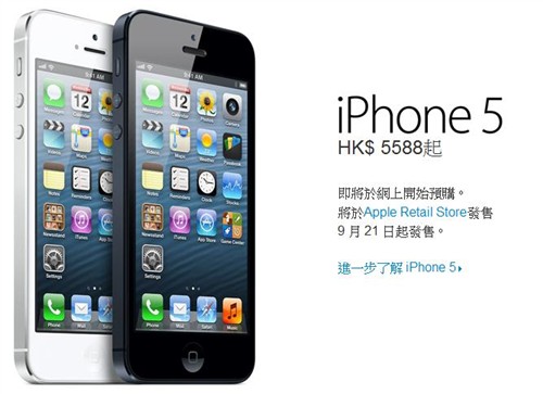 中国香港第一次加入iPhone首批开售国家和地区的行列,目前当地苹果官网显示,这里的iPhone 5售价为港币5588元起,这是非合约机的售价。