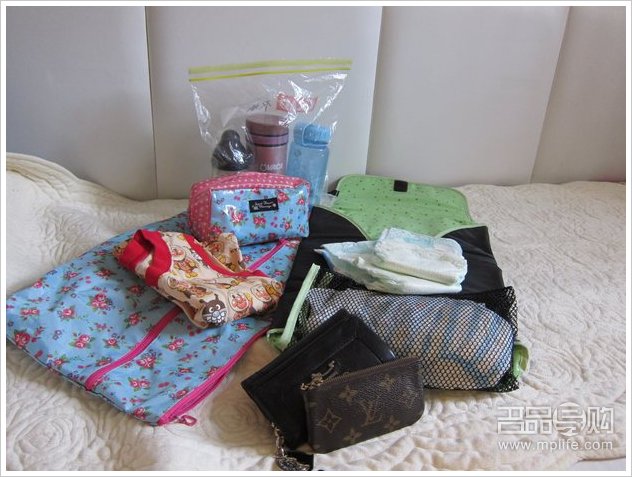 带 BB 出街最紧要冷热水各一枝、奶樽、奶粉、尿片垫、一套衫同纱巾系最基本外出用品还有我的银包、化妆袋