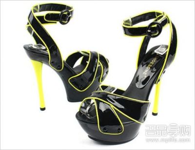 宋茜同款荧光撞色边装饰高跟凉鞋,漆皮材质与荧光黄的搭配,十分时髦