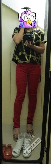 IZZUE金属花纹短装上衣 + 同品牌红色仔裤 + 新败的豹纹高防水台凉鞋