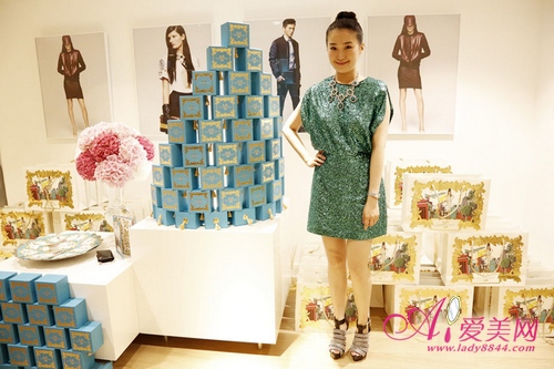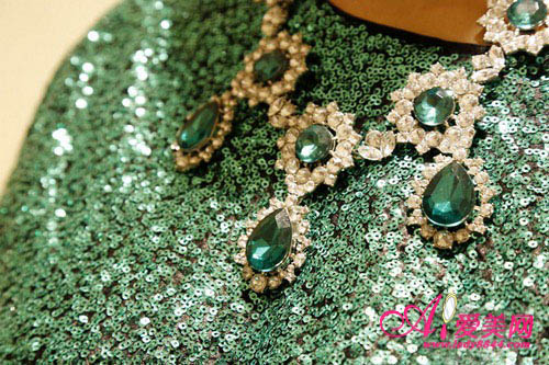 绿色亮片连衣裙搭配祖母绿水钻项链,同色系的搭配,在水钻的衬托下得到点缀。