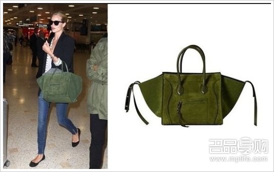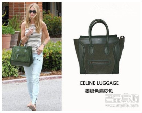超模罗西·汉丁顿-惠特莉(Rosie Huntington-Whiteley)一身简单的条纹无袖TEE配上牛仔裤。手臂上的Celine 墨绿色麂皮囧包成了最亮眼的配饰,虽然麂皮在夏天看起来略有点厚重,可是可爱的设计和低调质感的颜色,让超模都不得不爱。