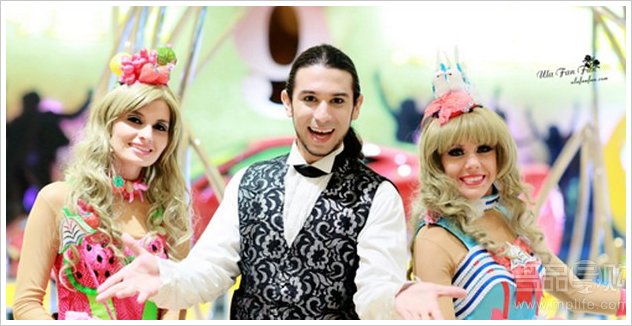 中间的是魔术师,操控两个娃娃进行表演,表演结束后可以和他们合照噢,他们很热情的。