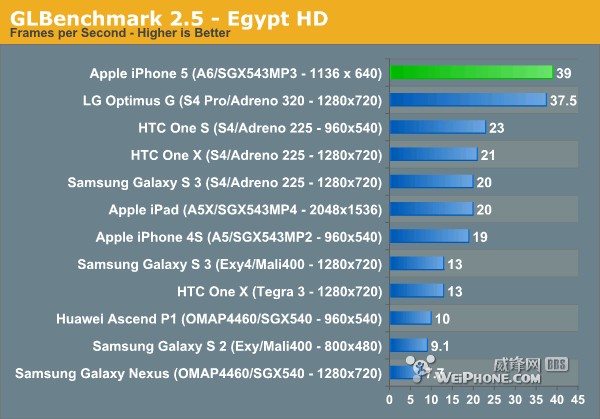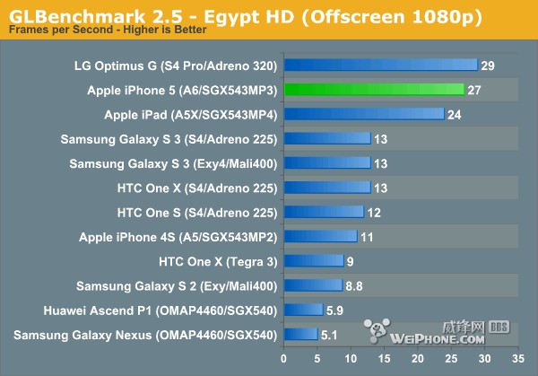 高质量Egypt HD场景中iPhone 5的跑得非常漂亮,令人惊喜的是,A6首次和目前最强大的高通Snapdragon S4 Pro处理器进行比较(iPhone 5 vs LG Optimus G),主角是PowerVR SGX 543MP3和Adreno 320。当分辨率限制在相同的1080p时,Optimus G、iPhone 5、新iPad这三款设备的结果极为接近,可以说高通在这方面还是有一定优势,不过Galaxy S III完完全全落后两倍,已经不符合今年最强Android旗舰的称号。