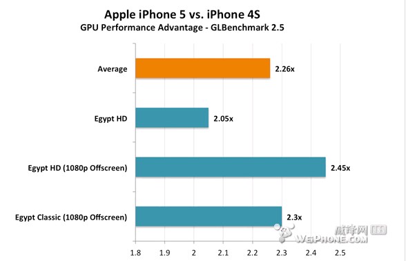最后,再来看看 GLBenchmark 2.5 游戏场景模拟测试中,iPhone 5 和 iPhone 4S的差距,其中Egypt场景开启垂直同步的成绩正好对应了苹果宣称的两倍GPU(图形处理)性能差距,而关闭垂直同步之后在 Egypt Classic 场景中iPhone 5图形性能却是4S的2.26倍。当然了,GPU性能更高并不意味着更高的帧速率,不过实际游戏中视觉效果的质量的确会更高。
