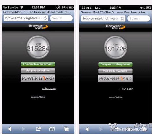 另外,在iPhone 5没有使用网络的情况下,性能可比在网时提升大约10%,下面BrowserMark跑分结果可以说明,前两张图iPhone 5没有接入AT&T网络,后者反之,同样的情况在SunSpider性能测试上也可以看出。