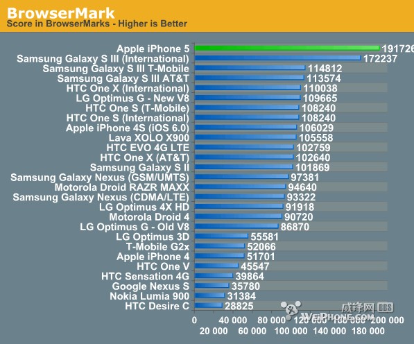 首先是iPhone 5内置浏览器Safari的benchmark跑分,使用主流的BrowserMark测试工具,该工具可以很好的对各平台手机的浏览器进行横向对比。总体而言,A6的CPU内核的性能极其优秀,稳居第一。iPhone 4S在升级IO6系统之后性能也得到提升了, BrowserMark分数从之前的89567一下子提升到106029。