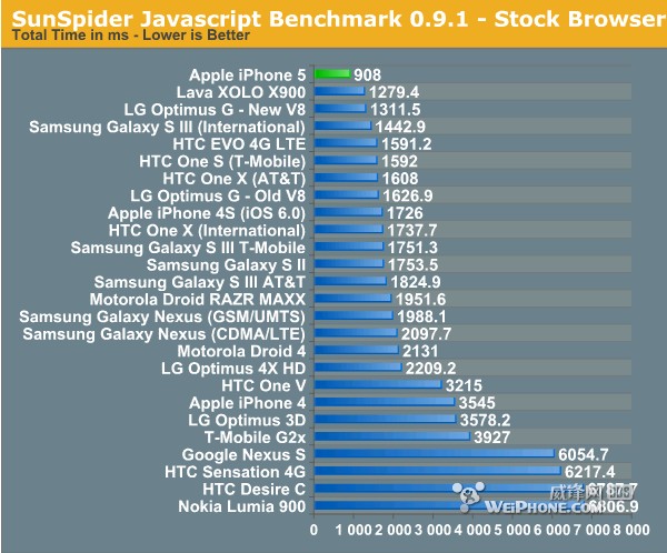 第二项是Sunspider JS Benchmark测试,该工具目前最流行的JavaScript测试工具之一 。苹果不仅对IOS6的JavaScript引擎做了很好地优化和改善,而且在这个极为体现高速缓存能力的测试中,我们看到A6的设计似乎比以往任何基于ARM的处理器都更优秀,更好的体现了内存带宽效率(iPhone 5的LPDDR2 1GB内存频率1066MHz)。英特尔Atom处理器此前在SunSpider测试中轻易超过ARM芯片得益于优秀的内存,现在我们看到A6的速度超过了英特尔,优势明显,只能说苹果的在芯片设计和内存上下了很大功夫。