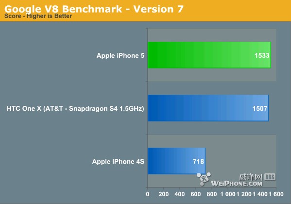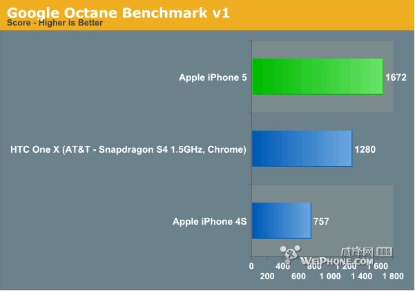 这次Anandtech还进行了Google V8、Octane JS测试,与SunSpider一样都是进行JavaScript测试。这里只拿AT&T版HTC One X和iPhone 4S进行对比,由于HTC的默认Web浏览器无法完整的加载 Octane JS测试,所以换成了Chrome浏览器。我们可以看到iPhone 5以巨大的优势领先iPhone 4S,与HTC One X水准相当,不过在Octane JS测试中iPhone 5却以高出30%的分数战胜了HTC One X。