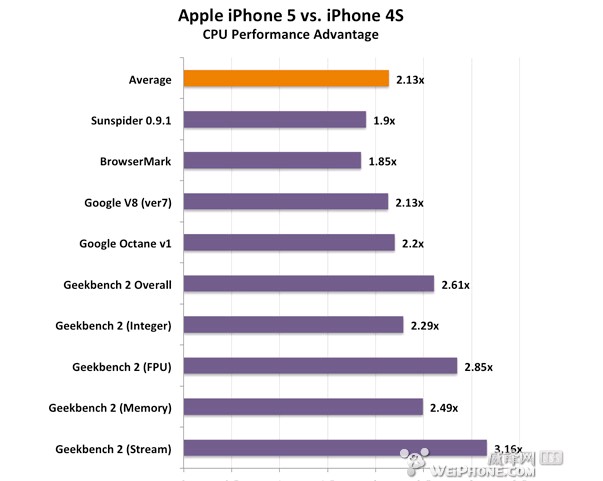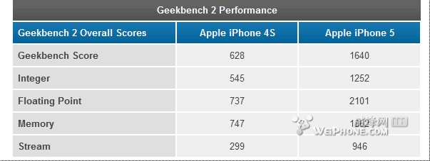CPU部分还有一项比较严格的Geekbench 2测试,这里只有iPhone 5和4S对比。