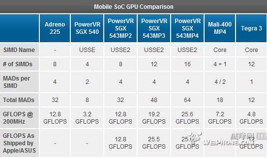 Anandtec解释iPhone 5采用三核心的PowerVR SGX 543MP3是因为芯片尺寸问题,四核SGX 543MP4的芯片尺寸明显比SGX 543MP3大,但是 SGX 543MP3 在不改变主频或超频的情况下,就可以获得两倍于SGX 543MP2的性能。主流GPU对比规格如下: