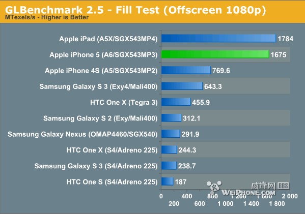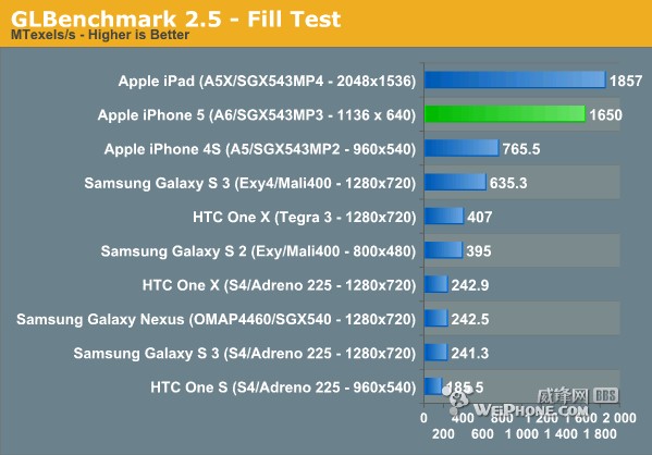 首先从最基本的原始理论像素填充率GLBenchmark 2.5 Fill Tese开始测试,iPhone 5填充性能为1.65GTexels/s,与第三代iPad咬得很紧,而且它的GPU性能优势超过了iPhone 4S两倍还多,GS3完全被秒得不见踪影。