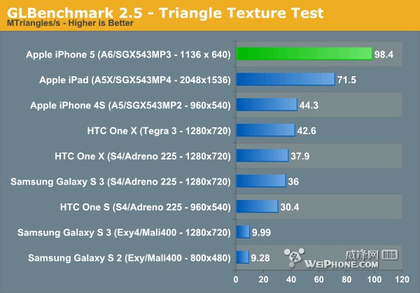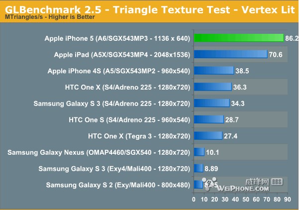 GLBenchmark 2.5 Triangle Texture各项测试结果(比较得分越高越好):