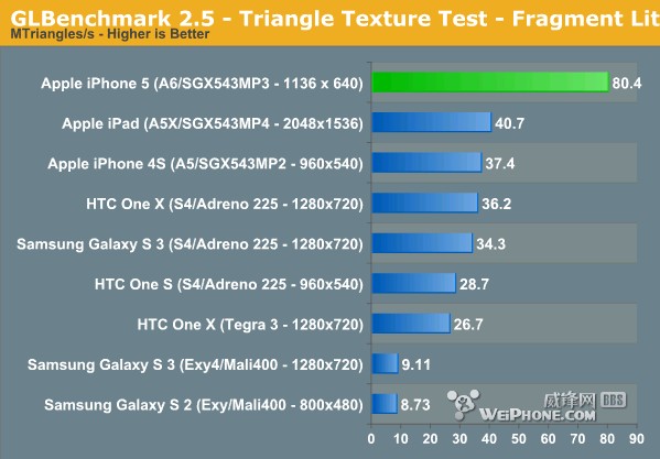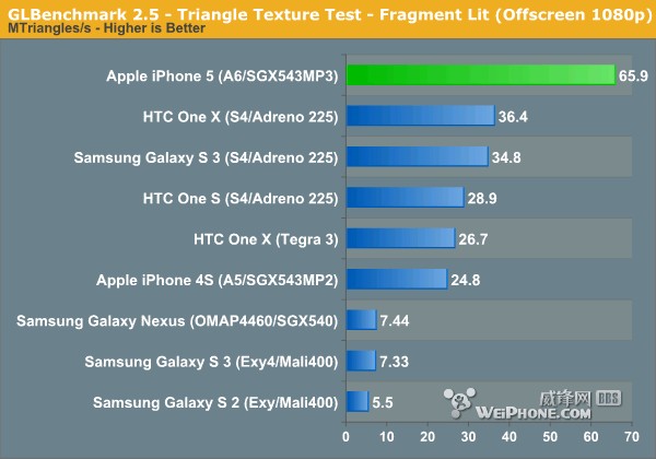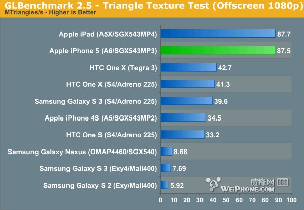 GLBenchmark 2.5 Triangle Texture测试中,iPhone 5三角形生成数据结果依然令人吃惊,考虑到iPhone 5分别比新iPad低,跑分结果要好不少,包括Fragment测试部分,不过当两者分辨率保持相同时的1080P时,A5X和A6成绩恢复正常: