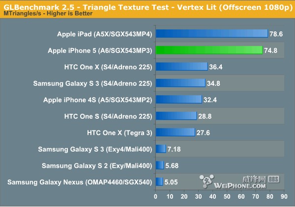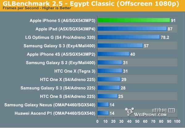 从跑分结果来看,A6芯片GPU的理论峰值几乎可以与第三代iPad的A5X GPU匹敌,其中最主要区别还是在于内存带宽,A5 A5X为128-bit,A6为64-bit。在内存带宽有限的情况下,A5X性能仍然让人刮目相看,不过这种结果也可能在iPhone 5比iPad 3原生分辨率低的条件下出现。下面GLBenchmark 2.5测试中,三代iPad的GPU跑分时仍运行IOS 5.1系统,如果升级IOS 6的话最终成绩可能会有所不同。