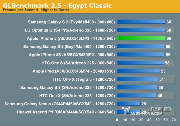 下一组是GLBenchmark 2.5 Egypt游戏场景模拟测试,这项测试工具相对较新,主要针对高清设备,依然支持跨平台基准测试,内置多个更高质量的高级3D场景,全新的Egypt HD版埃及场景和Classic普通版两种。其跑分结果同样是为了让人更直观关的了解设备内置芯片的GPU游戏性能。很多经过这项测试的高分辨率设备都倍感压力巨大,但iPhone 5的新GPU似乎轻松的应付过去了。
