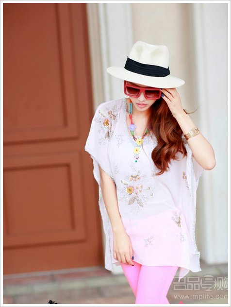 重工的一件刺绣上衣,搭配了小脚裤,都是粉嫩的色系。上衣偏蝙蝠袖,适合手臂有点肉肉的女生噢。裤子是很修身的,弹性很不错。