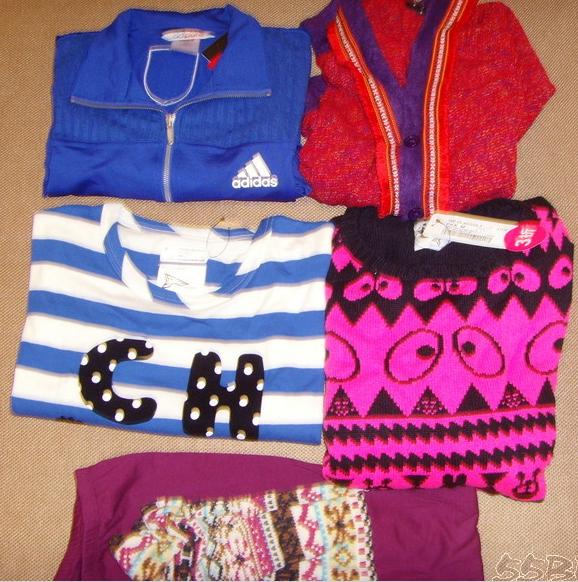 中间两件是东荟IT收的,一件t原价379和一件毛衣原价1199港币,打三折再七五折,最后换算汇率。一共是337.下面是打底裤50港币,右上角就是花车内的100港币衣服,左上角adidas290港币。