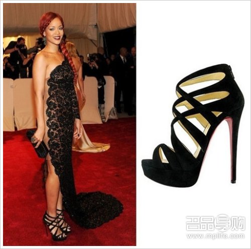 Rihanna穿着Christian Louboutin“Balota” 红底凉鞋。