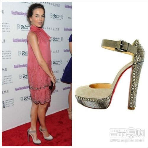 Camilla Belle穿着Christian Louboutin “Luxura” 铆钉红底鞋。