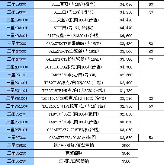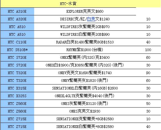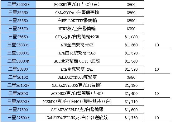 以下报价,如表内无特殊说明,则为原装配件的行货/后行/水货/上台机报价,一般来说原装配件为一电一充,“克”意思为黑色,“繁简英”是指手机所支持的语言,“繁简输”是指手机支持的输入法,“笔画”是指手机的键盘有笔画刻字。