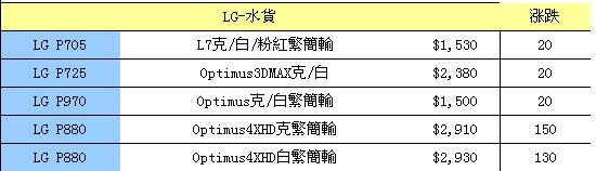 本周的LG手机自然是保持着降价,并且四核旗舰手机P880再度给大家带来惊喜,因为本周再降150港元,使得该机性价比暴涨,目前报价2910港元,折合人民币也仅两千多元,十分有诱惑力。虽然不排除还会有大降的可能,但喜欢四核旗舰手机的朋友可要看准时机下手啦。