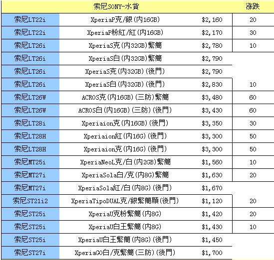 上周的索尼手机出现了集体暴降的情况,可能因为某些原因导致。而本周的索尼依旧保持全线下降,只是下降的幅度缩小,最大下跌也仅60港元,不算异常。近期的索尼手机依然是保持不断更新,新机陆续诞生。在LT26w之后,又有LT26ii即将到来,单一个后缀就有三台机型,在全部品牌的手机中也不多见。不过目前为止,索尼仍然没有四核手机,在顶级旗舰产品方面与以往相似,还是有所欠缺。