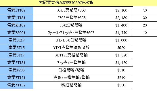 索尼爱立信手机依然大致是这些款式,最热门的仍然是LT18i,在前几周不断小涨之后,本周又有所回落,看来人气还没有散尽。至于前期也属于热门机型的ST18i目前仍售1450港元,性价比已十分低,价格比双核的索尼ST25i还要高一点,看来的确也只适合收藏用了。