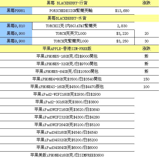 2012年9月22日香港手机报价:先达作为香港的水货手机圣地,同时也销售港行和后行,后行是指撕了保修标签的行货,花100元左右买一个标签贴上去就和行货无异了,而且能得到保修。我们为各位提供的是先达商家拿货的上层报价单,而这份报价单来自先达批货上层,可以说整个中国大陆从香港拿的货价格和这个报价单差异不大,绝对权威。